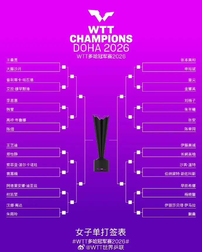 具体到本次多哈冠军赛,女单世界第二王曼昱是赛事1号种子,她与世界第七的队友陈熠,同处1/4区,而世界第四的队友陈幸同,则与日本选手张本美和在3/4区。就看同同能否阻击张本美和。